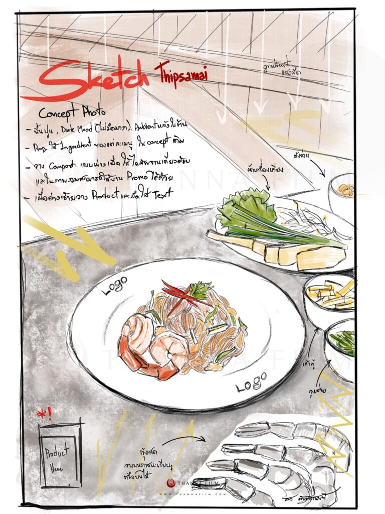 Concept sketch are used to define mood, composition, and real-world application before shooting.